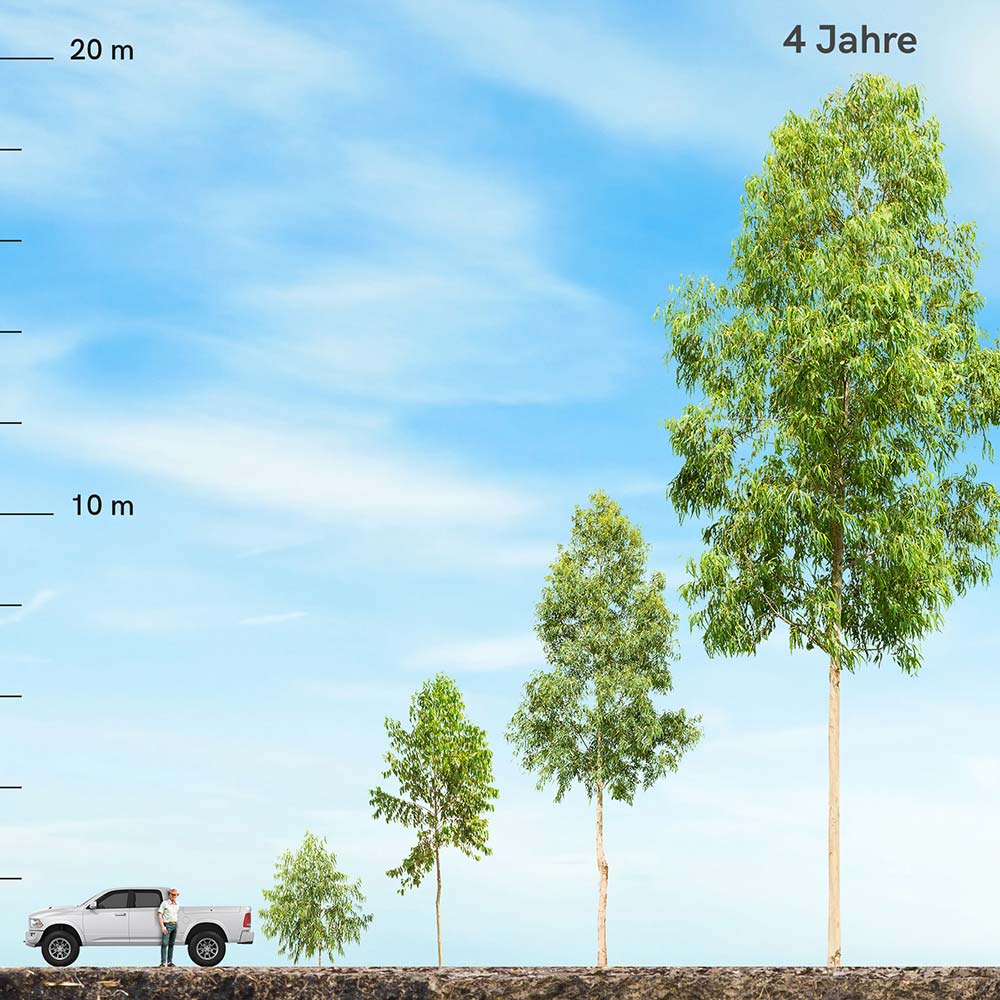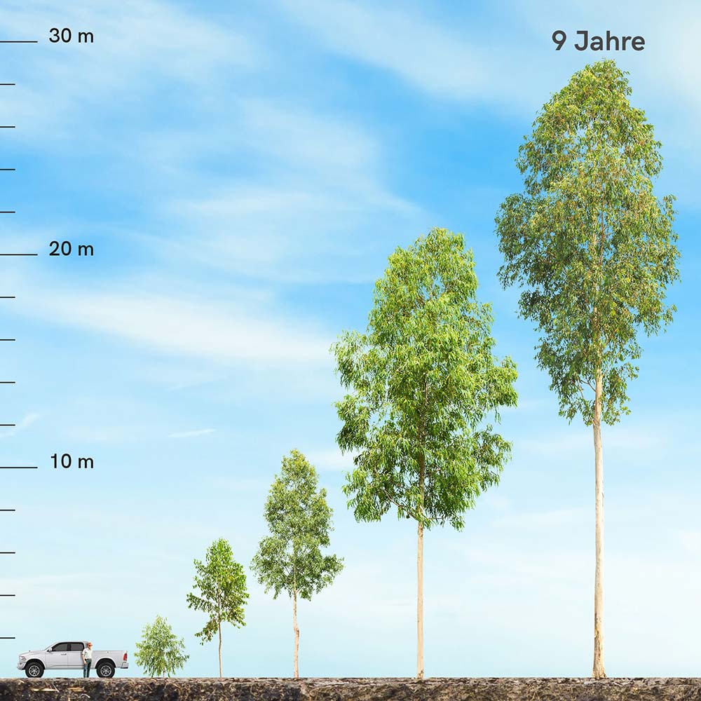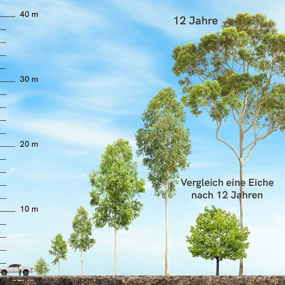 Das Herzstück unserer Anpflanzungen: ein besonders schnell wachsender Eukalyptus. Die von uns verwendete Sorte ist perfekt auf die Klimabedingungen und Bodenbeschaffenheit in Paraguay ausgerichtet. Dadurch erreichen wir ein Wachstum von 5-7 m pro Jahr. Und zwar qualitativ hochwertiges und auf dem Holzmarkt gefragtes Hartholz.