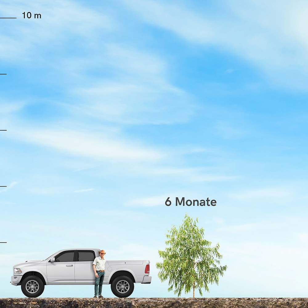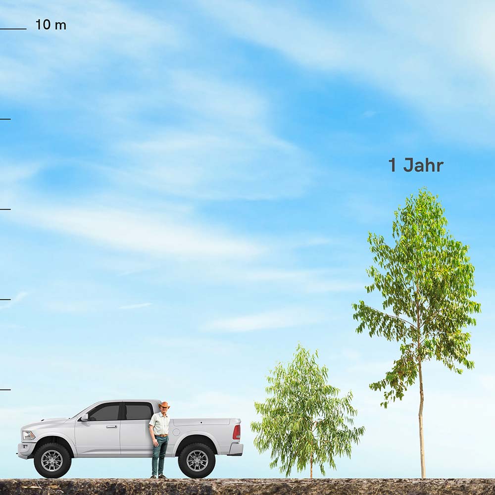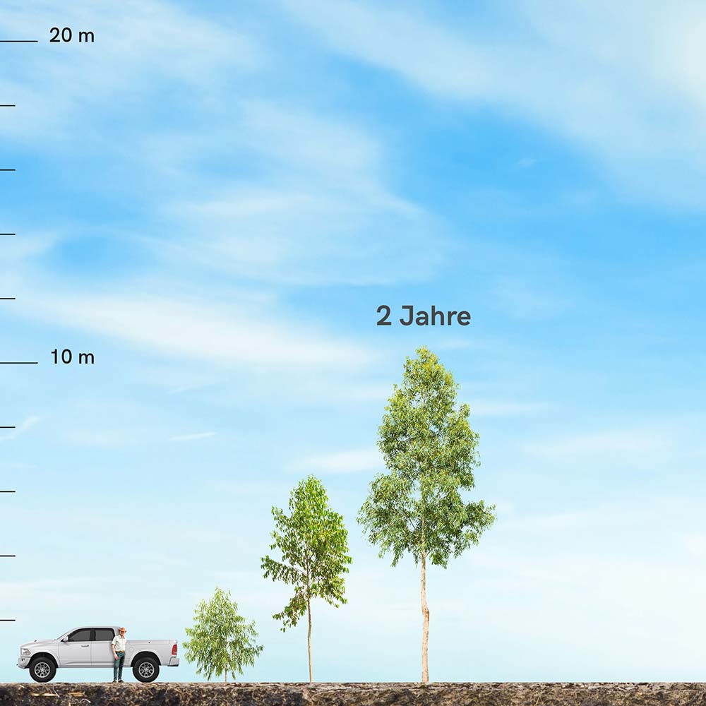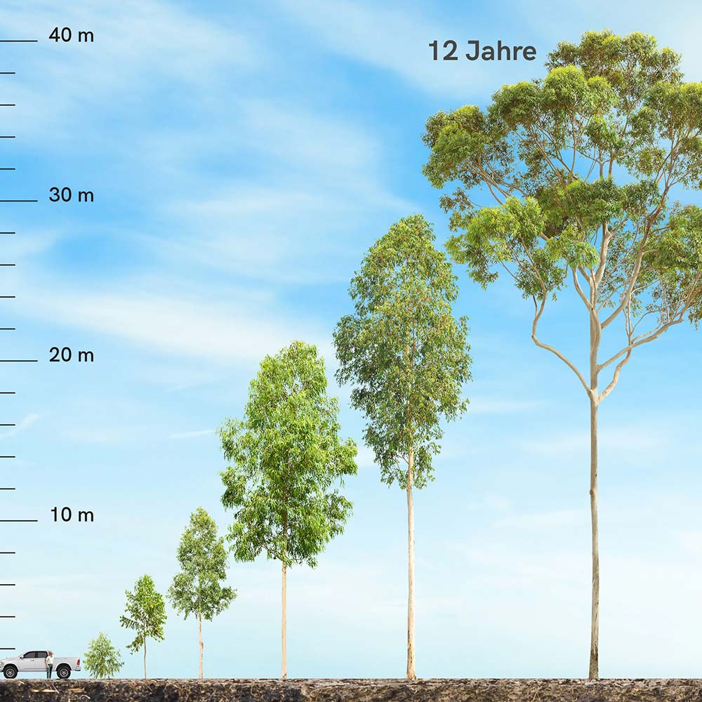 Das Herzstück unserer Anpflanzungen: ein besonders schnell wachsender Eukalyptus. Die von uns verwendete Sorte ist perfekt auf die Klimabedingungen und Bodenbeschaffenheit in Paraguay ausgerichtet. Dadurch erreichen wir ein Wachstum von 5-7 m pro Jahr. Und zwar qualitativ hochwertiges und auf dem Holzmarkt gefragtes Hartholz.